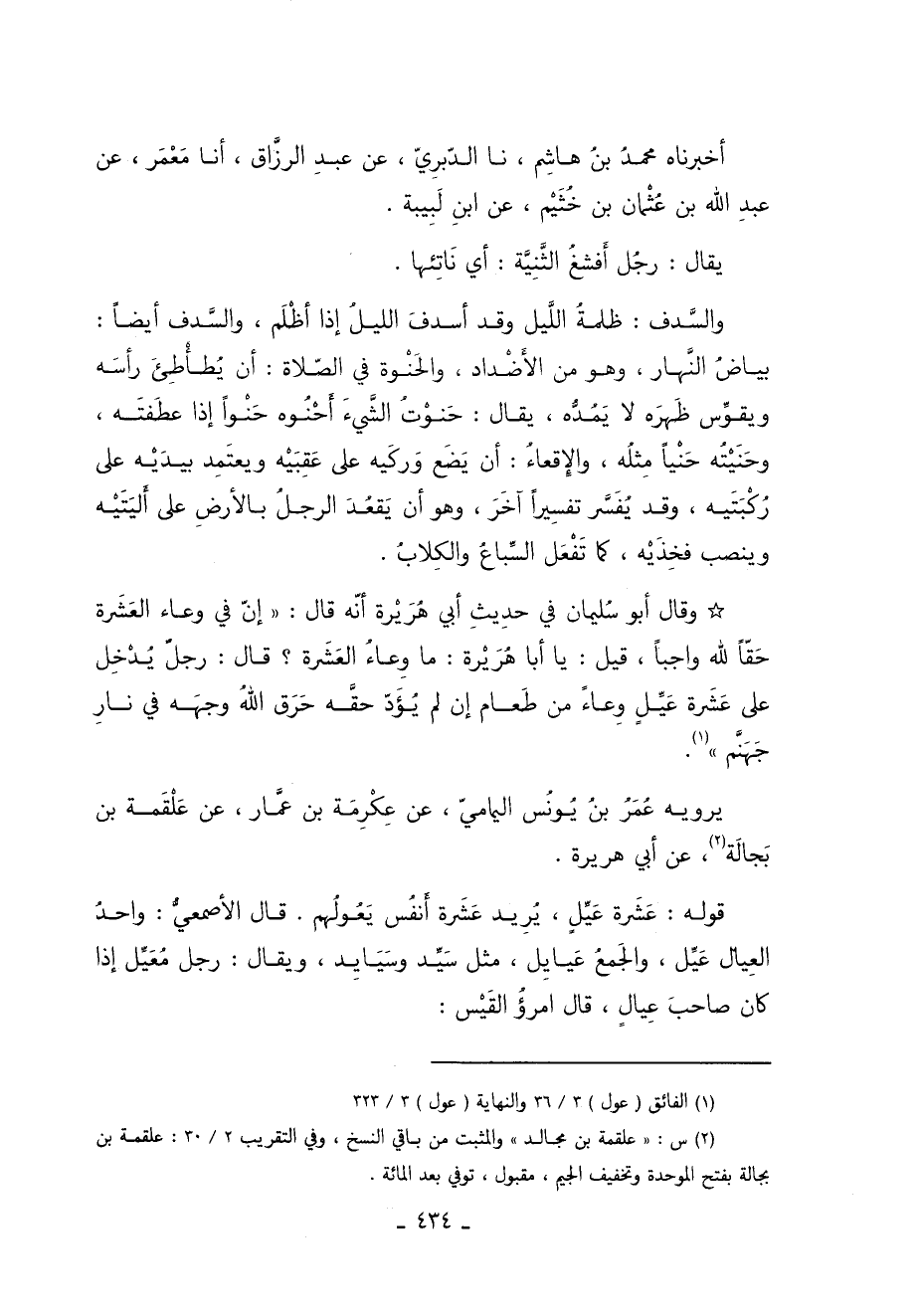 والسدف: ظلمة الليل وقد أسدف الليل إذا أظلم والسدف أيضا بياض النهار وهو من الأضداد والحنوة في الصلاة: أن يطأطئ رأسه ويقوس ظهره لا يمده يُقَالُ: حنوت الشيء أحنوه حنوا إذا عطفته وحنيته حنيا مثله والإقعاء: أن يضع وركيه على عقبيه ويعتمد بيديه على ركبتيه وقد يفسر تفسيرا آخر وهو أن يقعد الرجل بالأرض على أليتيه وينصب فخذيه كما تفعل السباع والكلاب.
