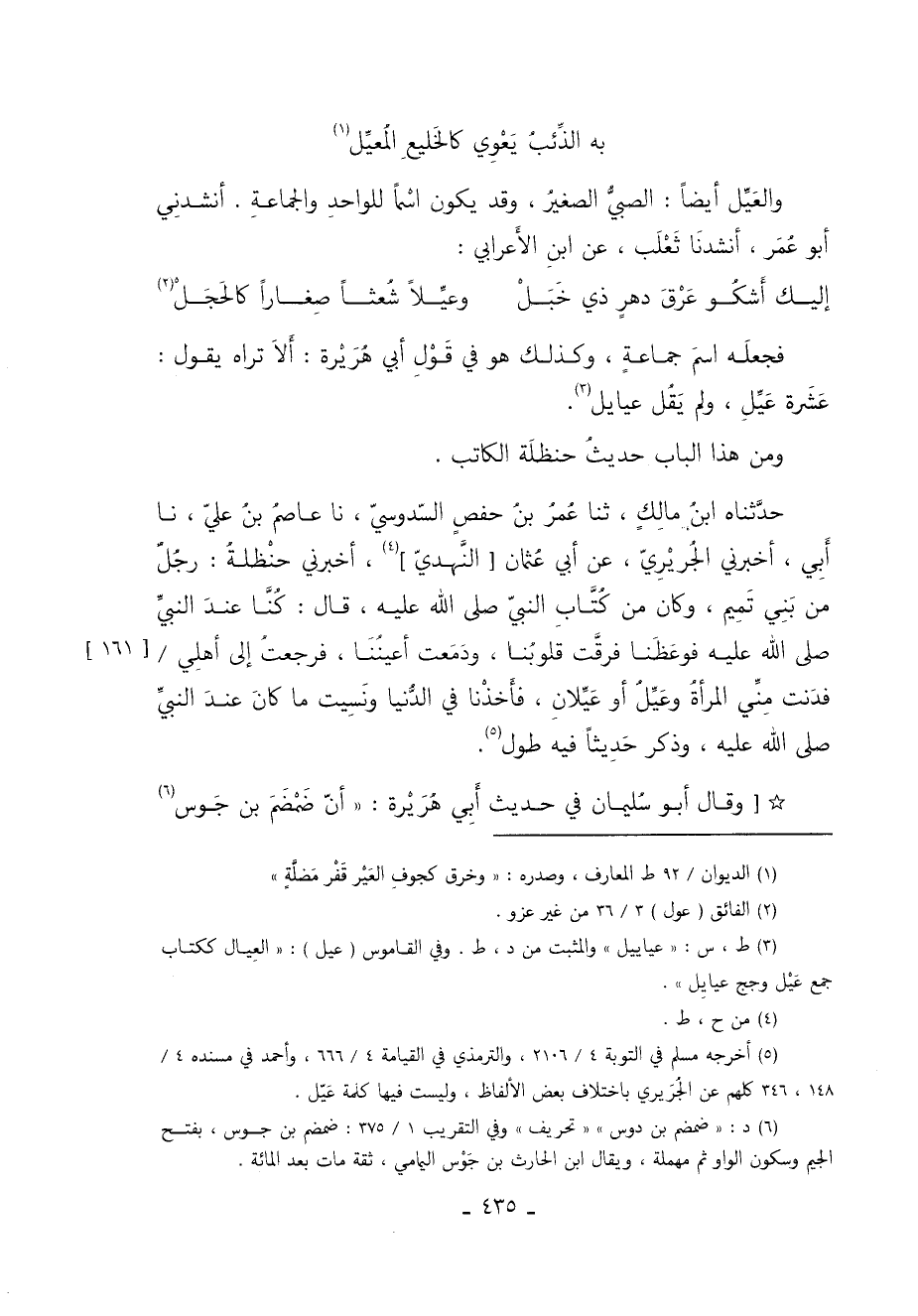 حدثناه ابن مالك حدثنا عمر بن حفص السدوسي أخبرنا عاصم بن علي أخبرنا أَبِي أَخْبَرَنِي الْجُرَيْرِيُّ عَنْ أَبِي عُثْمَانَ النَّهْدِيِّ 4 أَخْبَرَنِي حَنْظَلَةُ رَجُلٌ مِنْ بَنِي تَمِيمٍ وَكَانَ مِنْ كتاب النبي قال كنا عند النبي فَوَعَظَنَا فَرَقَّتْ قُلُوبُنَا وَدَمِعَتْ أَعْيُنُنَا فَرَجَعْتُ إِلَى أَهْلِي / فَدَنَتْ مِنِّي الْمَرْأَةُ وَعَيِّلٌ أَوْ عَيِّلانِ فَأَخَذْنَا فِي [161] الدُّنْيَا وَنَسِيتُ مَا كَانَ عند النبي وذكر حديثا فيه طول 5.