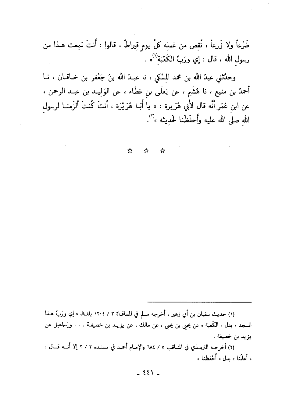 1 حديث سفيان بن أبي زهير أخرجه مسلم في المساقاة "3/ 1204" بلفظ "إي ورب هذا المسجد" بدل "الكعبة" عن يَحْيَى بْنُ يَحْيَى عَنْ مَالِكٍ عن يزيد ين خصيفة. وإسماعيل عن يزيد بن خصيفة.