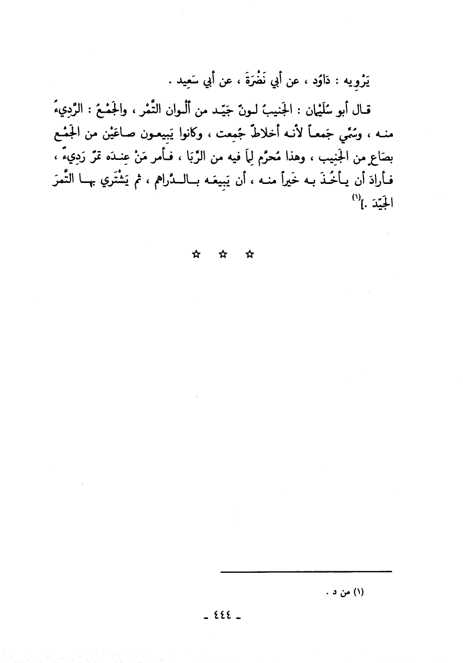 قَالَ أَبُو سُلَيْمَانَ الجنيب لون جيد من ألوان التمر والجمع الرديء منه وسمي جمعا لأنه أخلاط جمعت وكانوا يبيعون صاعين من الجمع بصاع من الجنيب وهذا محرم لما فيه من الربا فأمر من عنده تمر رديء فأراد أن يأخذ به خيرا منه أن يبيعه بالدراهم ثم يشتري بها التمر الجيد 1.