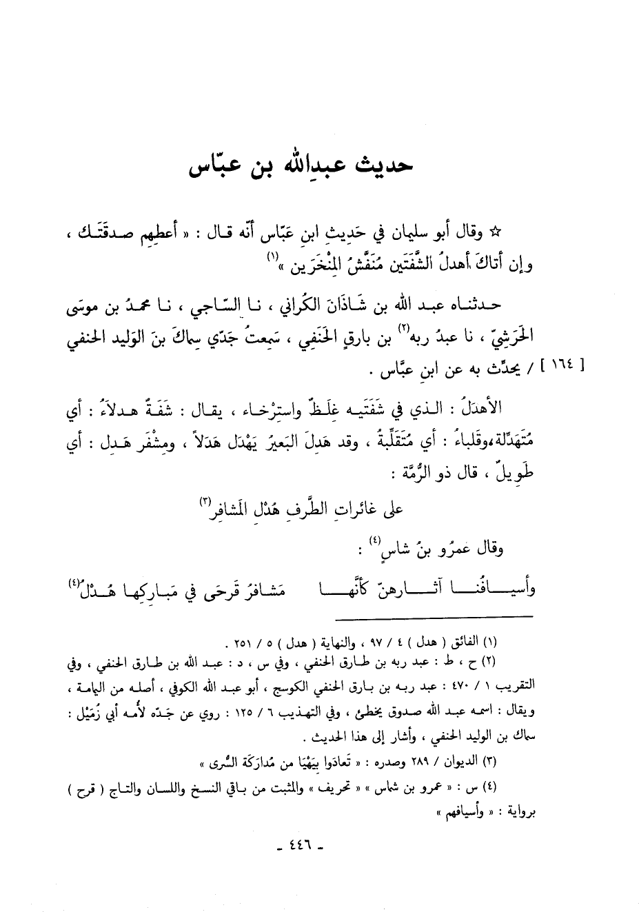حَدِيثِ ابْنِ عَبَّاسٍ أٍنه قَالَ: "أَعْطِهِمْ صَدَقَتَكَ وَإِنْ أَتَاكَ أَهْدَلُ الشفتين منفش المنخرين".
