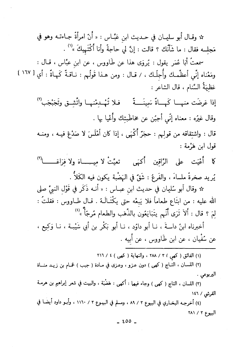 وَقَالَ أَبُو سُلَيْمَانَ فِي حَدِيثِ ابْنِ عَبَّاسٍ أَنَّهُ ذَكَرَ فِي قول النبي: "مَنِ ابْتَاعَ طَعَامًا فَلا يَبِعْهُ حتى يكتاله". قال طاووس: فَقُلْتُ: لِمَ؟ قَالَ: أَلا تَرَى أَنَّهُمْ يَتَبَايَعُونَ بِالذَّهَبِ وَالطَّعَامِ مُرَجَّأً 1.
