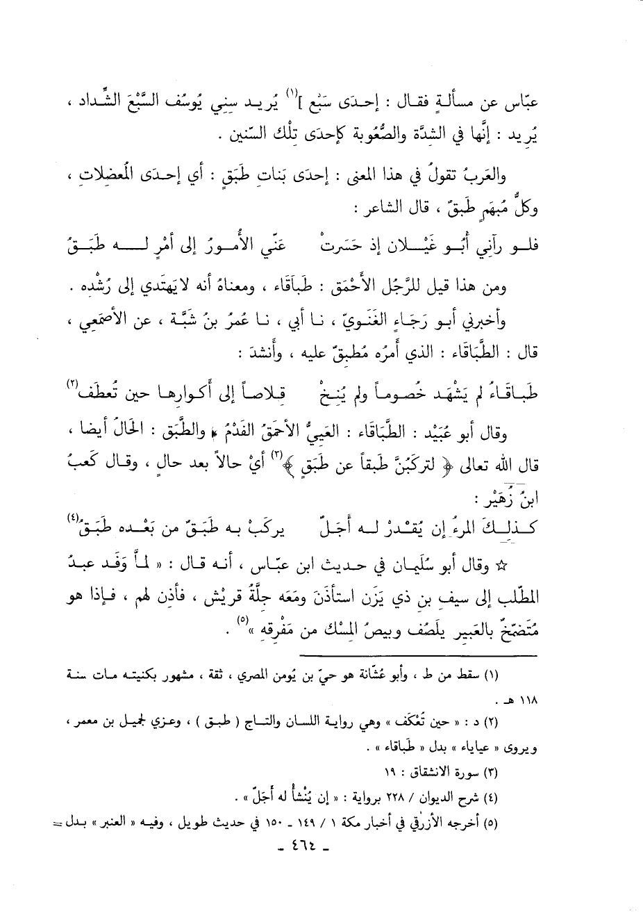 وَقَالَ أَبُو عبيد الطباقاء العيي الأحمق الفدم والطبق الحال أيضا قَالَ اللَّهُ تَعَالَى: {لَتَرْكَبُنَّ طَبَقاً عَنْ طَبَقٍ} 3 أي حالا بعد حال وَقَالَ كعب ابن زهير: