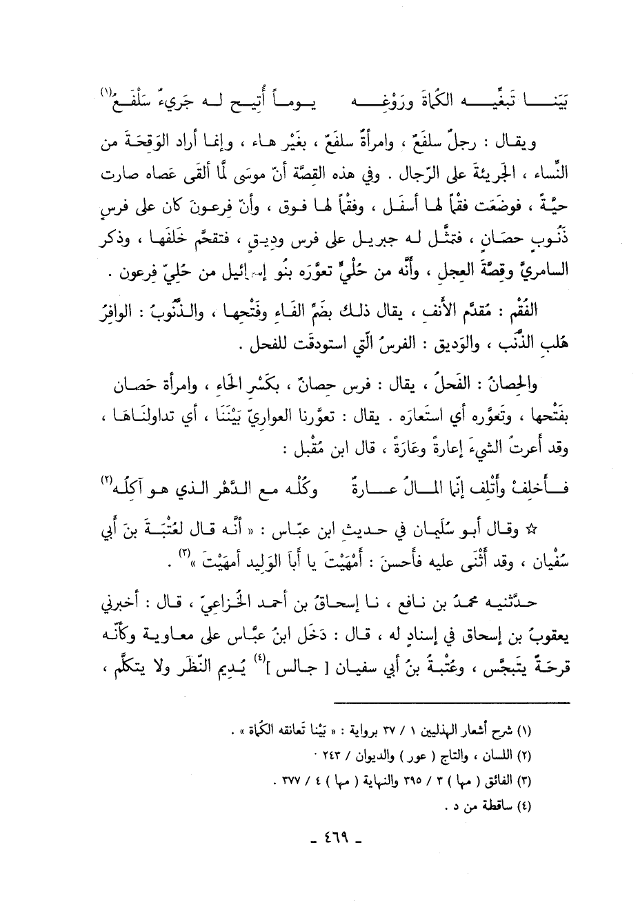 ويقال: رجل سلفع وامرأة سلفع بغير هاء وإنما أراد الوقحة من النساء الجريئة على الرجال. وفي هذه القصة أن موسى لما ألقى عصاه صارت حية فوضعت فقما لها أسفل وفقما لها فوق وأن فرعون كان على فرس ذنوب حصان فتمثل له جبريل على فرس وديق فتقحم خلفها وذكر السامري وقصة العجل وأنه من حلي تعوره بنو إسرائيل من حلي فرعون.