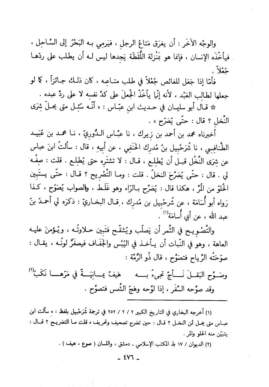 أَخْبَرَنَاهُ مُحَمَّدُ بْنُ أَحْمَدَ بن زيرك أخبرنا عباس الدوري أخبرنا محمد بن عبيد الطنافسي أخبرنا شُرَحْبِيلُ بْنُ مُدْرَكٍ الْحَنَفِيُّ عَنْ أَبِيهِ قَالَ: سَأَلْتُ ابْنَ عَبَّاسٍ عَنْ شِرَى النَّخْلِ قَبْلَ أَنْ يُطْلِعَ قَالَ: لا تَشْتَرِهِ حَتَّى يُطْلِعَ. قُلْتُ: صِفْهُ لِي. قَالَ: حتى يصرح النخل قلت: وَمَا التَّصْرِيحُ قَالَ: حَتَّى يَسْتَبِينَ الْحُلْوُ مِنَ الْمُرِّ هَكَذَا قَالَ: يُصَرَّحَ بِالرَّاءِ وَهُوَ غَلَطٌ وَالصَّوَابُ يُصَوَّحَ كَذَا رَوَاهُ أَبُو أُسَامَةَ عَنْ شُرَحْبِيلِ بْنِ مُدَرْكٍ قَالَ الْبُخَارِيُّ ذَكَرَهُ لِي أَحْمَدُ بْنُ عَبْدِ اللَّهِ عَنْ أَبِي أُسَامَةَ 1.
