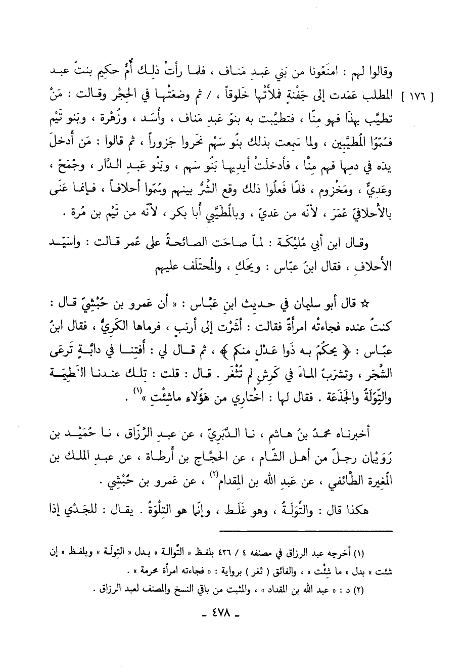 وَقَالُوا لهم: امنعونا من بني عَبْد مناف فلما رأت ذلك أُمِّ حَكِيمِ بِنْتِ عَبْدِ الْمُطَّلِبِ عمدت إلى جفنة فملأتها [176] خلوقا / ثم وضعتها في الحجر وقالت من تطيب بهذا فهو منا فتطيبت به بنو عَبْد مناف وأسد وزهرة وبنو تيم فسموا المطيبين ولما سمعت بذلك بنو سهم نحروا جزورا ثم قالوا: من أدخل يده في دمها فهم منا فأدخلت أيديها بنو سهم وبنو عَبْد الدار وجمح وعدي ومخزوم فلما فعلوا ذلك وقع الشر بينهم وسموا أحلافا فإنما عنى بالأحلافي عُمَر لأنه من عدي وبالمطيبي أبا بكر لأنه من تيم بن مرة.
