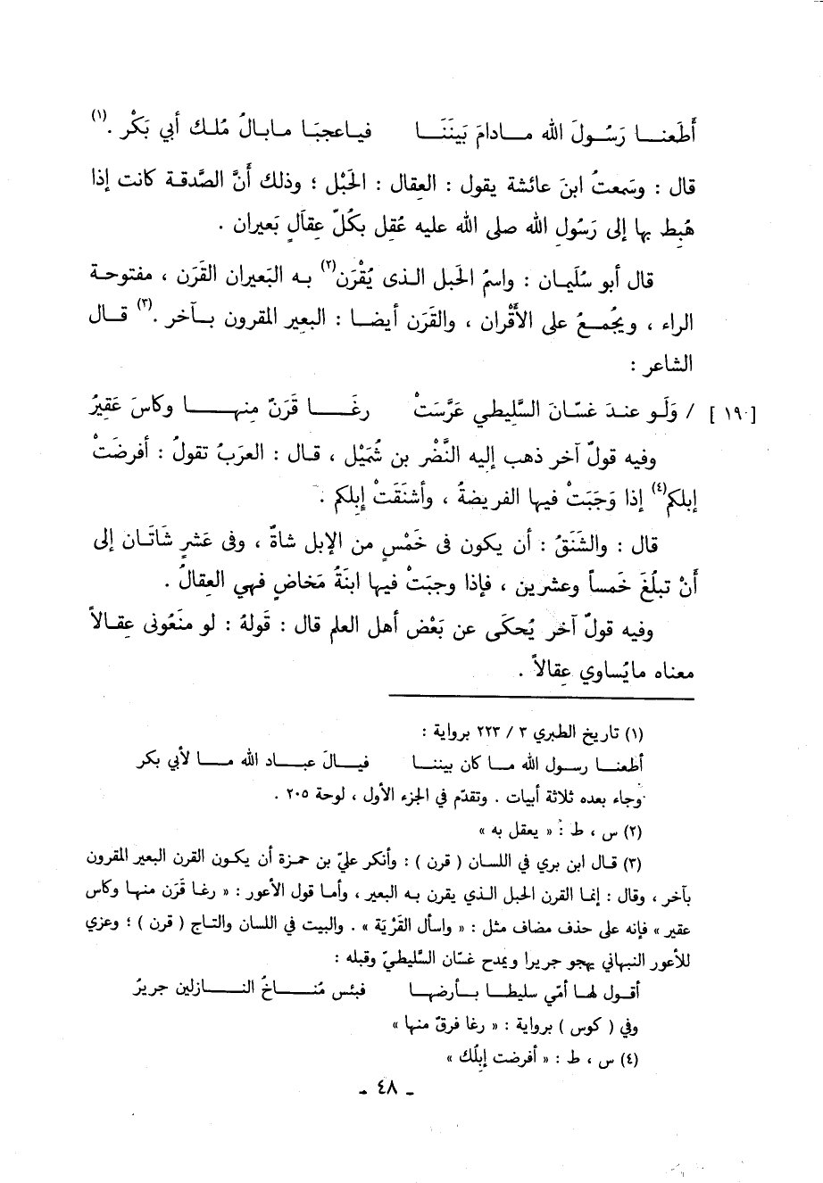 3 قال ابن بري في اللسان "قرن": وأنكر علي بن حمزة أن يكون القرن البعير المقرون بآخر, وقال: إنما القرن الحبل الذي يقرن به البعير. وأما قول الأعور: "رَغَا قَرَنٌ مِنْهَا وكاسَ عَقِيرُ" فإنه على حذف مضاف مثل: {وَاسْأَلِ الْقَرْيَةَ} والبيت في اللسان والتاج "قرن" وعزى للأعور النبهاني يهجو جريرا ويمدح غسان السلطي وقبله: