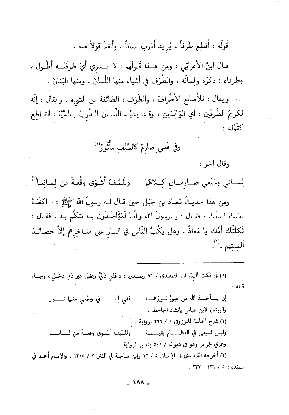 وَمِنْ هَذَا حَدِيثُ مُعَاذِ بْنِ جَبَلٍ حِينَ قَالَ: لَهُ رَسُولُ اللَّهِ صَلَّى اللَّهُ عَلَيْهِ وَسَلَّمَ: "اكْفُفْ عَلَيْكَ لِسَانَكَ" فَقَالَ: يَا رَسُولَ اللَّهِ وَإِنِّا لَمُؤَاخَذُونَ بِمَا نَتَكَلَّمُ بِهِ؟ فَقَالَ: "ثَكِلَتْكَ أُمُّكَ يَا مُعَاذُ وَهَلْ يَكُبُّ النَّاسَ فِي النِّارِ عَلَى مَنَاخِرِهِمْ إِلا حَصَائِدُ أَلْسِنَتِهِمْ" 3.