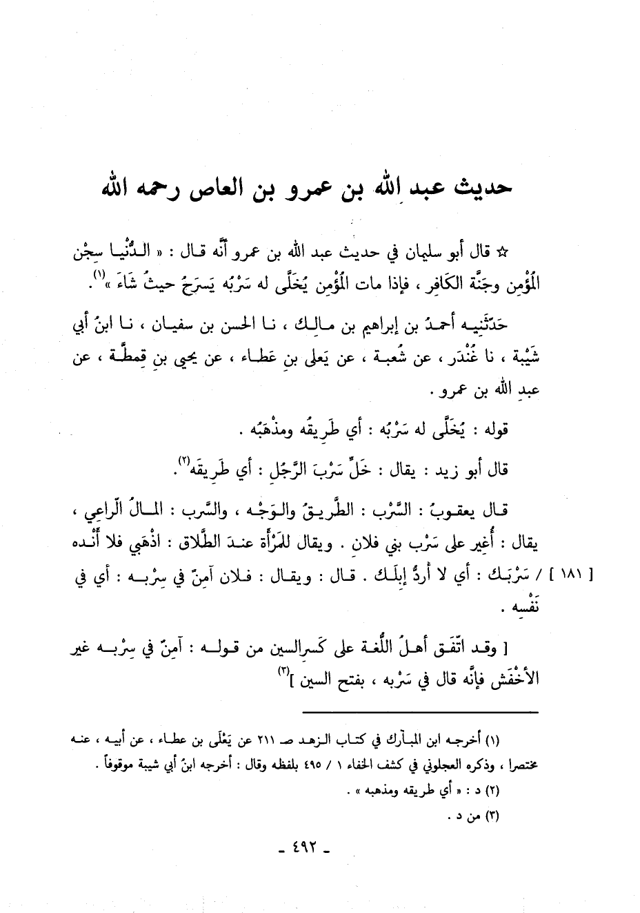 حديث عَبْد اللَّه بن عمرو أَنَّهُ قَالَ: "الدُّنْيَا سِجْنُ الْمُؤْمِنِ وَجَنَّةُ الْكَافِرِ فَإِذَا مَاتَ الْمُؤْمِنُ يُخَلَّى لَهُ سَرْبُهُ يُسَرَّحُ حَيْثُ شاء".