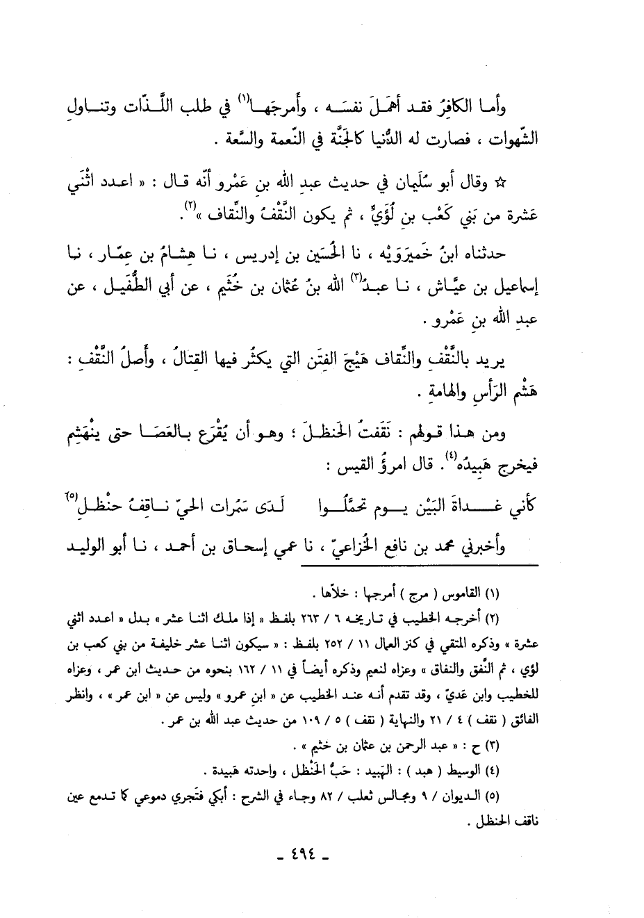 وَقَالَ أَبُو سُلَيْمَانَ فِي حَدِيثِ عَبْد الله بن عَمْرو أنه قَالَ: اعْدُدِ اثْنَيْ عَشْرَةَ مِنْ بَنِي كَعْبِ بْنِ لُؤَيٍّ ثُمَّ يَكُونُ النَّقْفُ وَالنِّقَافُ 1.