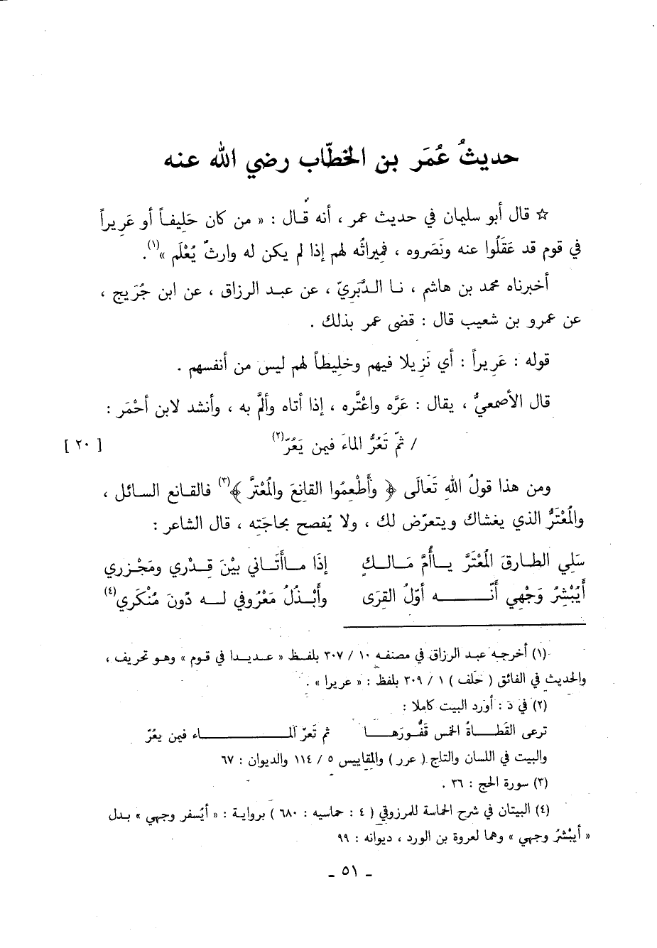 ومِن هَذَا قَولُ اللَّهِ تَعَالَى: {وَأَطْعِمُوا الْقَانِعَ وَالْمُعْتَرَّ} 3 فالقانع السائل والمُعَتَّرُ الَّذي يَغْشَاكَ ويتعرض لك ولا يفصح بحاجته قَال الشَّاعِرُ: