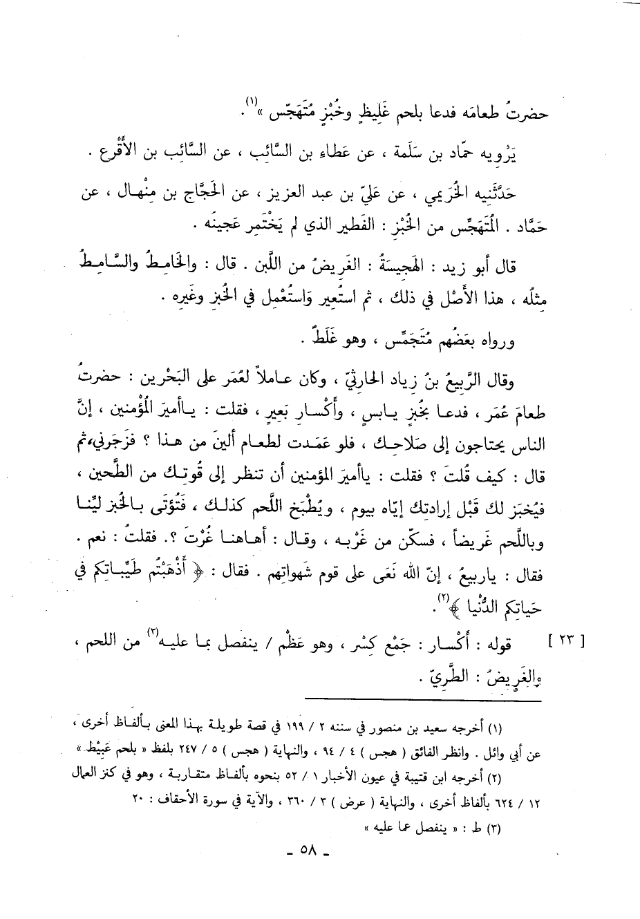 [23] قوله: أَكْسَار جَمْعُ كَسْر وهو عَظْمٌ / يَنْفَصِلُ بِمَا عليهِ 3 من اللَّحْمِ والغريض الطري.