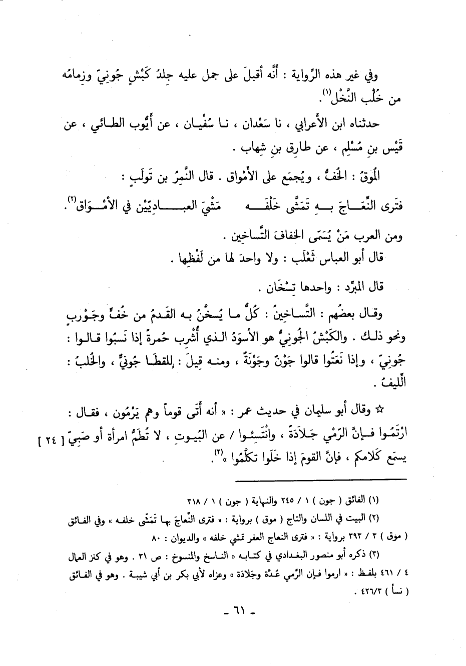 2 البيت في اللسان والتاج "موق" برواية "فترى النعاج تمشى خلفه" وفي الفائق "موق" "3/ 393" برواية "فترى النعاج تمشي خلفه" والديوان "80".