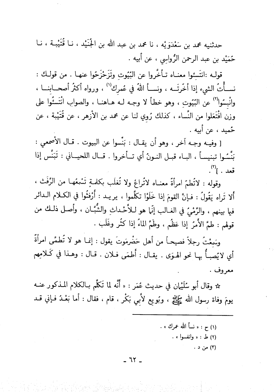 قَوْله انْتَسِئُوا مَعْنَاهُ تَأَخَّرُوا عَنِ البِيوت وتَزَحْزَحُوا عَنْهَا. مِن قولك نَسَأْتُ الشَّيء إذا أَخَّرْتَهُ ونسأ اللهُ في عُمْرِكَ 1 ورواه أَكْثَرُ أصحابنا وانبسوا 2 عَنِ البيوت وهُوَ خَطَأ لا وَجْهَ لَهُ هَاهُنَا والصَّوَاب انْتَسِئُوا عَلى وَزْنِ افْتَعِلوا مِن النِّسَاء كَذَلك رُوِيَ لنا عَن مُحَمَّد بن الأَزْهَر عَنْ قُتَيْبَة عَنْ حميد عن أبيه.