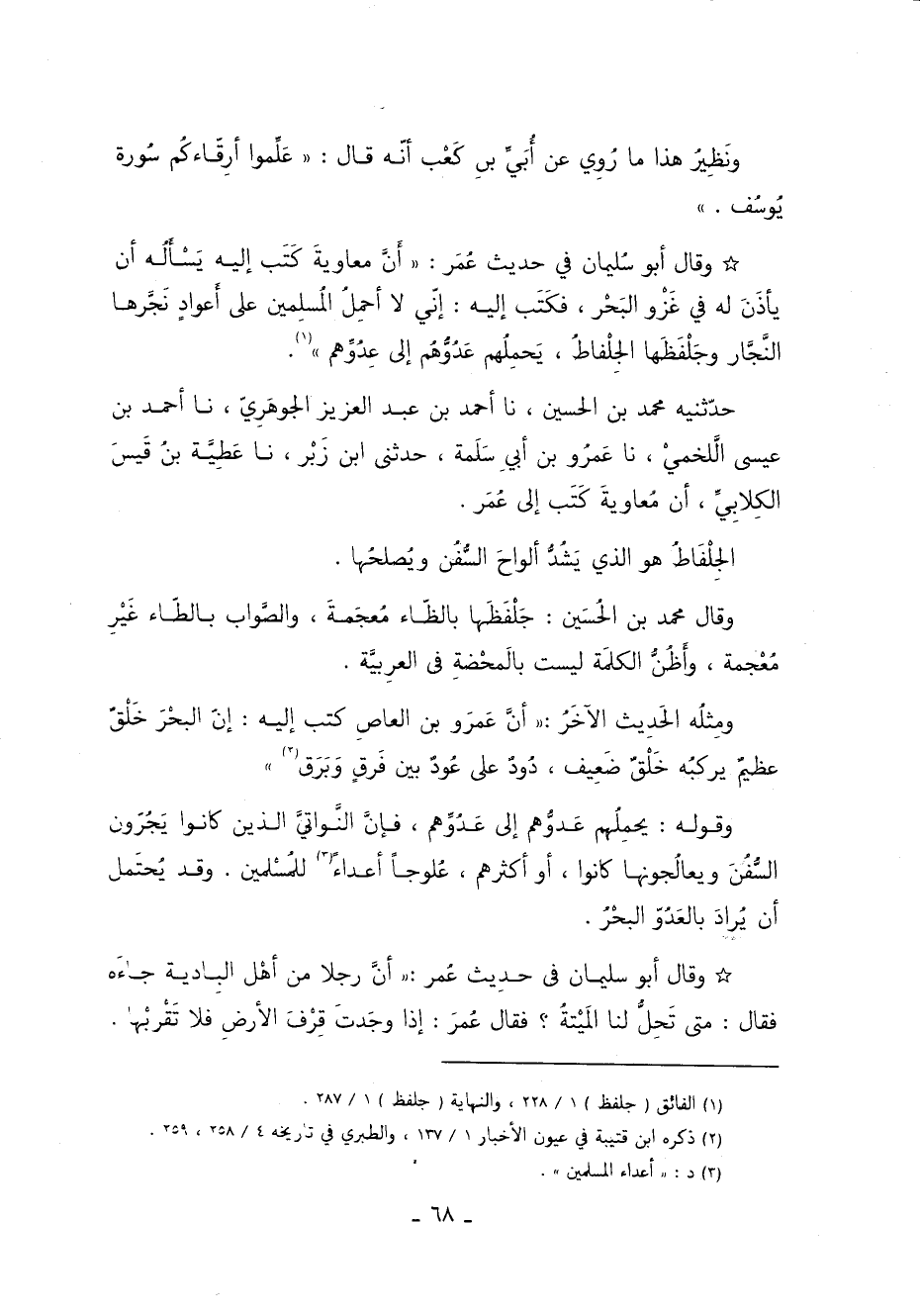 وَقَالَ أَبُو سُلَيْمَانَ فِي حَدِيثِ عُمَرَ أَنَّ مُعَاوِيَةَ كَتَبَ إِليْهِ يَسْأَلُهُ أَنْ يَأْذَنَ لَهُ فِي غَزْوِ الْبَحْرِ فَكَتَبَ إِلَيْهِ إِنِّي لا أَحْمِلُ الْمُسْلِمِينَ عَلَى أَعْوَادٍ نَجَّرَهَا النَّجَّارُ وَجَلْفَظَهَا الْجِلْفَاطُ يَحْمِلُهُمْ عَدُوُّهُمْ إِلَى عَدُوِّهِمْ 1.