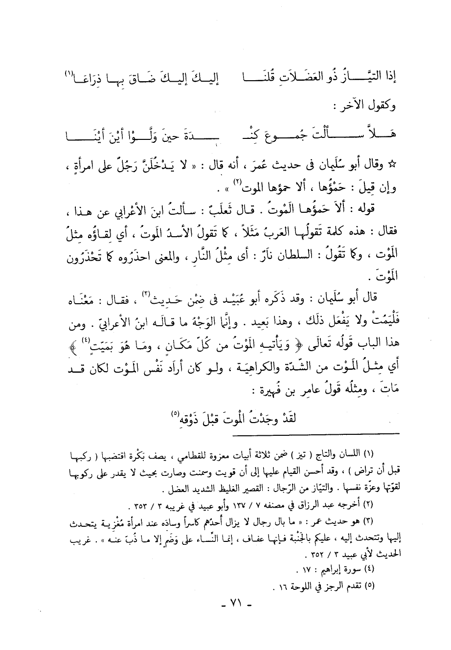 قَال أَبُو سُلَيْمَان وقَد ذكره أبو عبيدة في ضِمْنِ حَدِيثٍ 2 فَقَال: مَعْنَاهُ فَلْيَمُتْ ولا يَفْعَل ذَلِك وهَذا بَعِيد وإنَّما الوَجْهُ مَا قَالَهُ ابنُ الأَعْرَابِيّ. ومِن هَذَا البَاب قَوْلُهُ تَعَالى: {وَيَأْتِيهِ الْمَوْتُ مِنْ كُلِّ مَكَانٍ وَمَا هُوَ بِمَيِّتٍ} 3 أي مِثْلَ المَوْتِ من الشِدَّةِ والكَرَاهِيَةِ ولَو كَانَ أَرَادَ نَفْسَ المَوْت لَكَانَ قَدْ مَات ومِثْلُهُ قَوْلُ عامِر بن فُهَيْرَة: