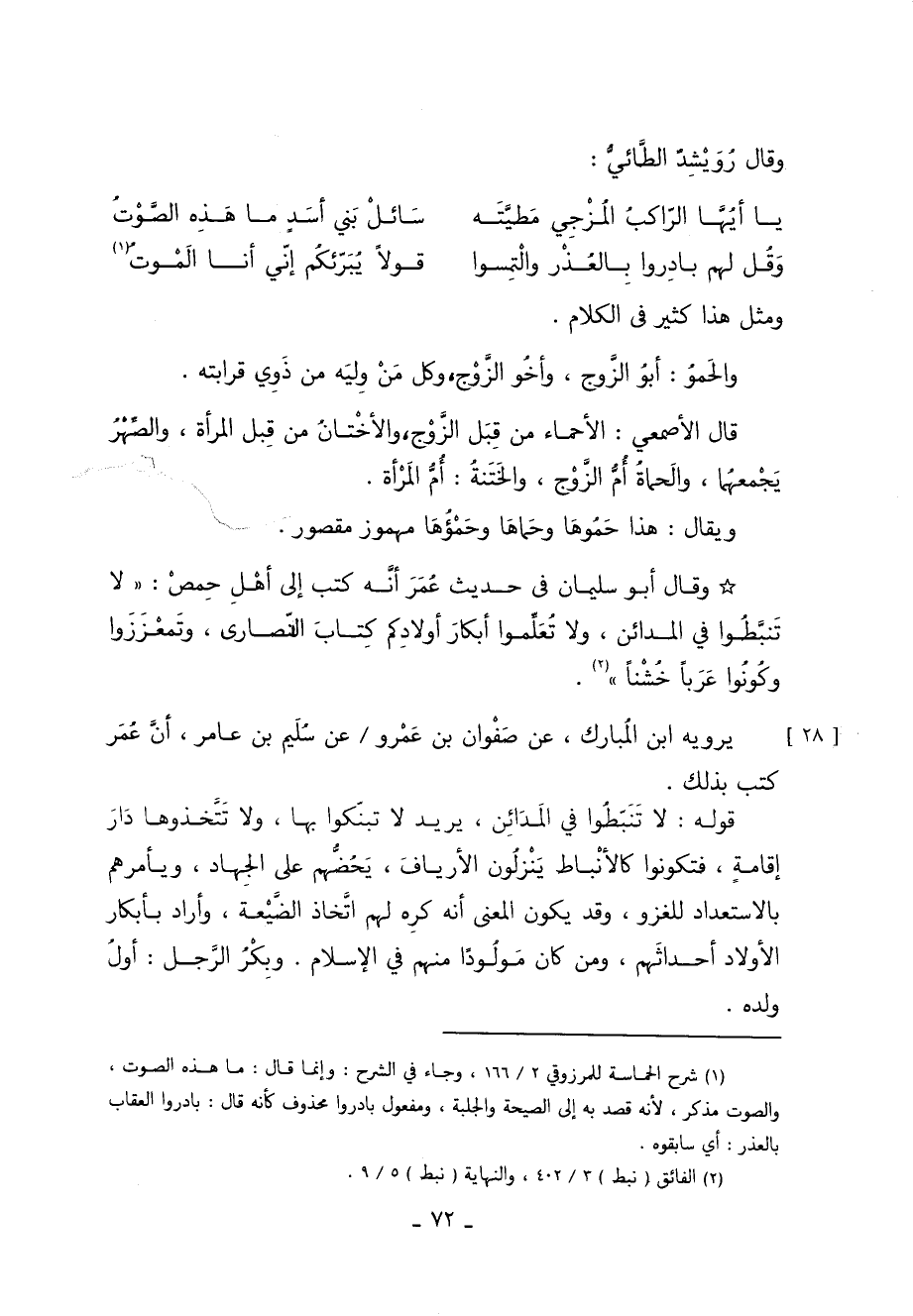 وَقَالَ أَبُو سُلَيْمَانَ فِي حَدِيثِ عُمَرَ أَنَّهُ كَتَبَ إِلَى أَهْلِ حِمْصٍ: "لا تَنَبَّطُوا فِي الْمَدَائِنِ وَلا تُعَلِّمُوا أَبْكَارَ أَوْلادِكُمْ كِتَابَ النَّصَارَى وَتَمَعْزَزُوا وَكُونُوا عَرَبًا خُشْنًا"1.