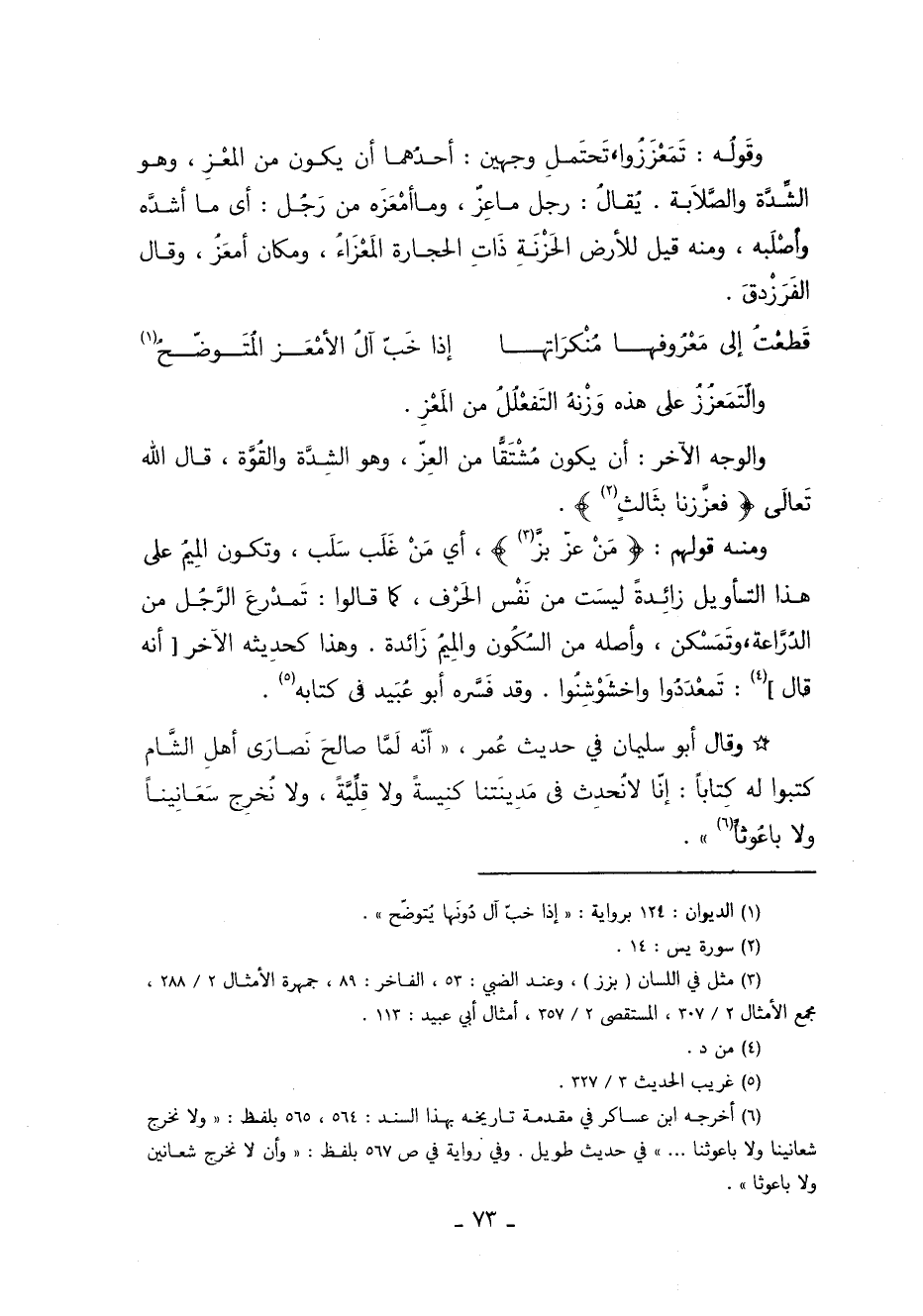 وقَوْلَه تَمَعْزَزُوا تَحْتَمِل وَجْهَين أَحَدَهُمَا أَنْ يَكُون مِن المَعْزِ وهُو الشِدَّة والصَّلابَة. يُقَال: رَجُلٌ مَاعِز ومَا أَمْعَزَهُ من رَجُلٍ أي ما أَشَدَّهُ وأَصْلَبَهُ ومِنْهُ قِيلَ للأرض الحَزْنَةِ ذَاتِ الحِجَارة المَعْزَاء ومَكَانٌ أَمْعَز وقَال الفَرَزْدَق: