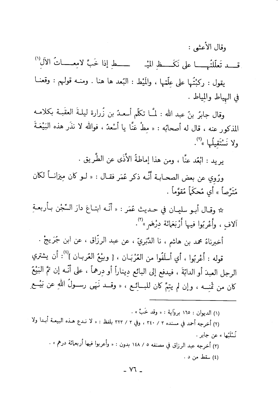 وَقَالَ جابر بن عبد الله لَمَّا تَكَلَّمَ أَسْعَد بن زُرارة ليلة العَقَبة بِكَلامِهِ المَذْكُور عَنْه قَالَ لَهُ أَصْحَابُهُ: مِطْ عَنَّا يَا أَسْعَد فَوَالله لا نَذَرُ هَذِه البَيْعَة ولا نَسْتَقِيلُها 2.