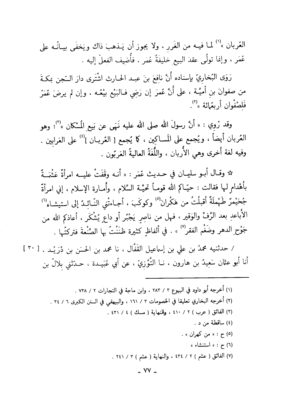 العربان 1 لما فيه من الغرر ولا يجوز أن يذهب ذاك ويخفى بيانه على عُمَر وإنما تولى عقد البيع خليفة عُمَر فأضيف الفعل إليه.