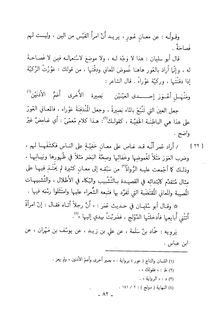 قَالَ أَبُو سُلَيْمَانَ هذا لا وجه له ولا موضع لاستعماله فيمن لا فصاحة له وإنما أراد بالعور هاهنا غموض المعاني ودقتها من قولك عورت الركية إذا دفنتها وركية عوراء. قال الشاعر: