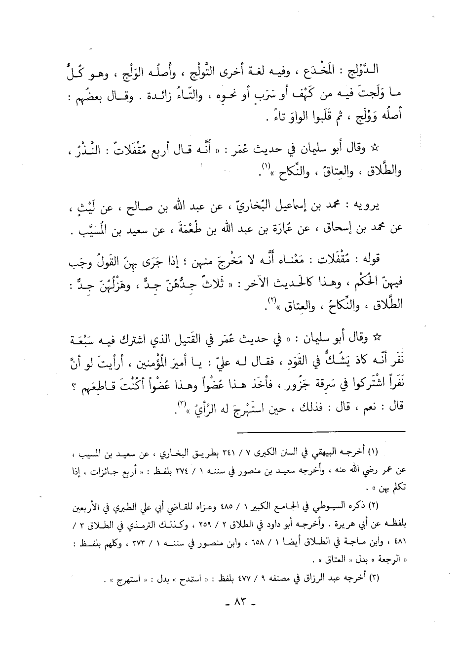 وَقَال أَبُو سُلَيْمَانَ فِي حَدِيثِ عُمَرَ أَنَّهُ قَالَ: أَرْبَعٌ مُقْفَلاتٌ النَّذْرُ وَالطَّلاقُ وَالْعِتَاقُ وَالنِّكَاحُ 1.