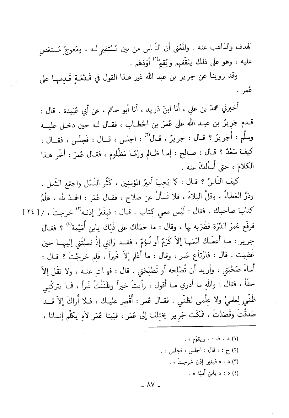 كَيْفَ النَّاسُ قَالَ: كَمَا يُحِبُّ أَمِيرُ الْمُؤْمِنِينَ كَثُرَ النَّسْلُ وَاجْتَمَعَ الشَّمْلُ وَدَرَّ الْعَطَاءُ وَقَلَّ الْبَلاءُ فَلا تَسْأَلْ عَنْ صَلاحٍ فَقَالَ عُمَرُ: الْحَمْدُ لِلَّهِ هَلُمَّ كِتَابَ صَاحِبِكَ. فَقَالَ: لَيْسَ مَعِي كِتَابٌ قَالَ: فَبِغَيْرِ إِذْنِهِ 3 خَرَجْتَ [34] / فَرَفَعَ عُمَرُ الدُّرَّةَ فَضَرَبَهُ بِهَا وَقَالَ: مَا حملك على ذلك يابن أُمَيْمَةَ 4؟ فَقَالَ جَرِيرٌ: مَا أَعْلَمَكَ اسْمَهَا إِلا كَرِمٌ أَوْ لَؤُمٌ فَقَدْ رَابَنِي إِذْ نَسَبْتَنِي إِلَيْهَا حِينَ غَضِبْتَ قَالَ: فَارْتَاعَ عُمَرُ وَقَالَ: مَا أَعْلَمُ إِلا خَيْرًا فَلِمَ خَرَجْتَ؟ قَالَ: أَسَاءَ صُحْبَتِي وَأُرِيدُ أَنْ تُصْلِحَهُ أَوْ تُصْلِحُنِي. قَالَ: فَهَاتِ عَنْهُ وَلا تَقُلْ إِلا حَقًّا فَقَالَ: وَاللَّهِ مَا أَدْرِي مَا أَقُولُ رَأَيْتُ خَيْرًا وَظَنَنْتُ شرًّا فَمَا يَتْرُكُنِي ظَنِّي لِعِلْمِي وَلا عِلْمِي لِظَنِّي. فَقَالَ عُمَرُ: أَقْصِرْ عَلَيْكَ فَلا أَرَاكَ إِلا قَدْ صَدَقْتَ وَقَصَدْتَ فَمَكَثَ جَرِيرٌ يَخْتَلِفُ إِلَى عُمَرَ فَبَيَّنَّا عمر لاه يكلم إنسانا