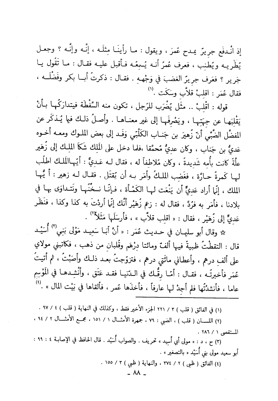 قوله: اقلب. مثل يضرب للرجل تكون منه السقطة فيتداركها بأن يقلبها عَنْ جهتها ويصرفها إلى غير معناها وأصل ذلك فيما يذكر عَنِ المفضل الضبي أن زهير بن جناب الكلبي وفد إلى بعض الملوك ومعه أخوه عدى بن جناب وكان عدي محمقا فلما دخل على الملك شكا الملك إلى زهير علة كانت بأمه شديدة وكان ملاطفا له فَقَالَ له: عدي أيها الملك اطلب لها كمرة حارة فغضب الملك وأمر به أن يقتل. فَقَالَ له زهير: أيها الملك إنما أراد عدي أن ينعت لها الكمأة فإنا نسخنها ونتداوى بها في بلادنا فأمر به فرد فَقَالَ له: زعم زهير أنك إنما أردت به كذا وكذا فنظر عدى إلى زهير فَقَالَ: اقلب قلاب فأرسلها مثلا 2.