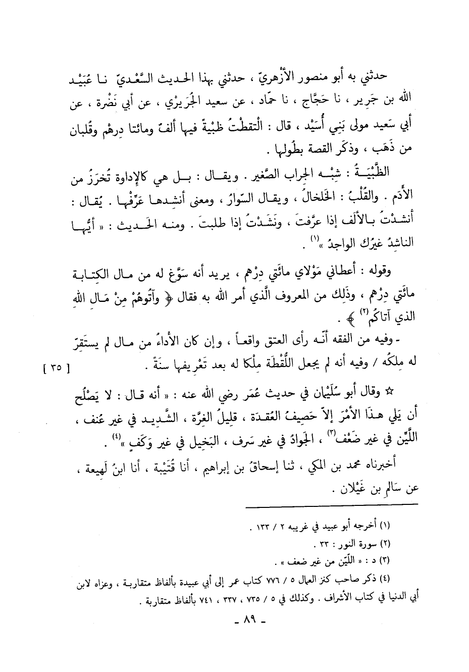 حَدَّثَنِي بِهِ أَبُو مَنْصُورٍ الأَزْهَرِيُّ حدثني بهذا الحديث السعدي أخبرنا عبيد الله بن جرير أخبرنا حجاج أخبرنا حَمَّادٌ عَنْ سَعِيدٍ الْجَرِيرِيِّ عَنْ أَبِي نَضْرَةَ عَنْ أَبِي سَعِيدٍ مَوْلَى بَنِي أُسَيْدٍ قَالَ: الْتَقَطْتُ ظِبْيَةً فِيهَا أَلْفُ وَمِائَتَا دِرْهَمٍ وَقَلْبَانِ مِنْ ذَهَبٍ وَذَكَرَ الْقِصَّةَ بِطُولِهَا.