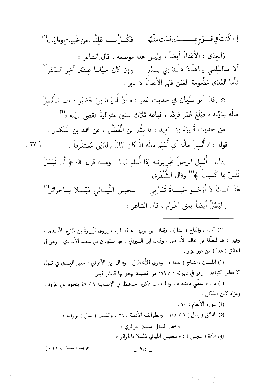 يُقَالُ: أبسل الرجل بجريرته إذا أسلم لها ومنه قول اللَّه {أَنْ تُبْسَلَ نَفْسٌ بِمَا كَسَبَتْ} 2 وَقَالَ الشنفري: