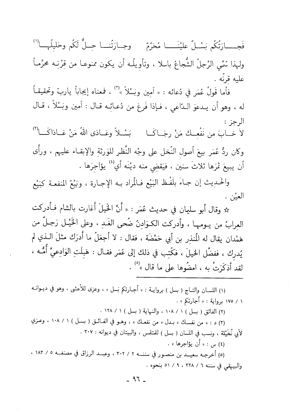 فأما قول عُمَر في دعائه آمين وبسلا 2 فمعناه إيجابا يا رب وتحقيقا له وهو أن يدعو الداعي فإذا فرغ من دعائه قَالَ: آمين وبسلا قال الرجز: