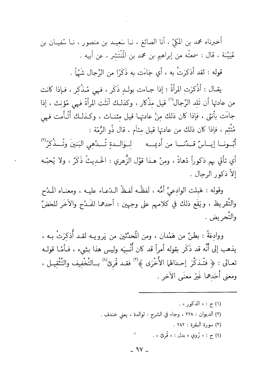 ووادعة بطن من همدان ومن المحدثين من يرويه لقد أذكرت به يذهب إلى أَنَّهُ قد ذكر بقوله أمرا قد كان أنسيه وليس هذا بشيء فأما قوله تعالى: {فَتُذَكِّرَ إِحْدَاهُمَا الْأُخْرَى} 3 فقد قرئ 4 بالتخفيف والتثقيل ومعنى أحدهما غير معنى الآخر