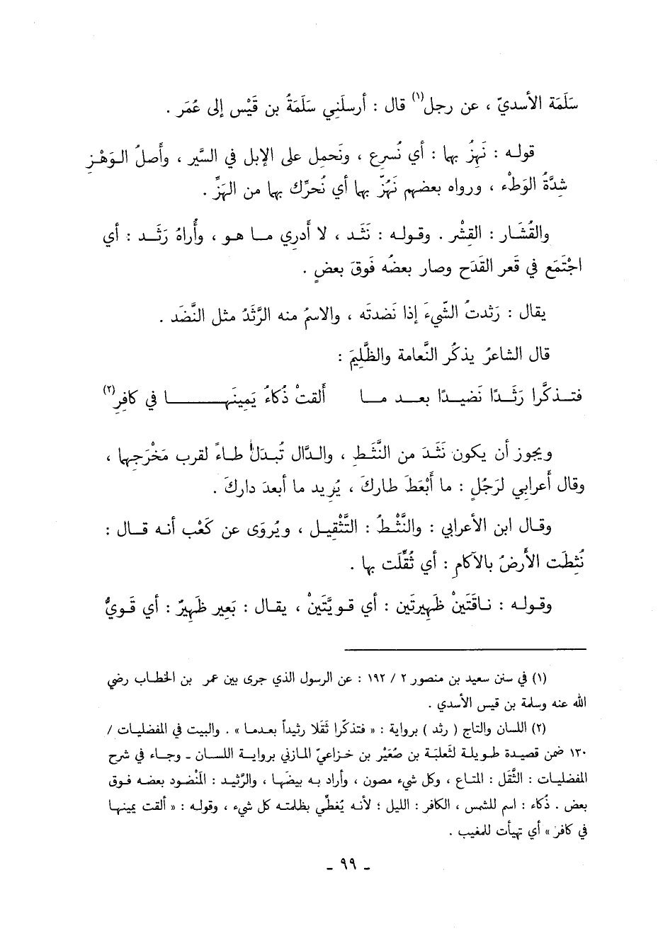 2 اللسان والتاج "رثد" برواية "فتذكرا ثقلا رثيدا بعدما" والبيت في المفضليات "130" ضمن قصيدة طويلة لثعلبة بن صعير بن خزاعي المازني برواية اللسان – وجاء في شرح المفضليات: الثقل: التاع, وكل شيء مصون, وأورد به بيضها والرثيد: المنضود بعضه فوق بعض, ذكاء: اسم للشمس الكافر: الليل لأنه يغطي يظلمته كل شيء وقوله: "ألقت يمينها في كافر" أي تهيأت للمغيب.