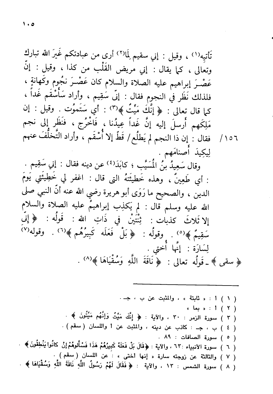 : أي طَعِينٌ، وهذه خَطيئَتهُ التي قال: اغفر لي خَطِيئَتي يَومَ الدين، والصحيح ما رَوَى أبو هريرة رضي الله عنه أنّ النبي صلى الله عليه وسلم قال: لم يَكذِب إبراهيمُ عليه الصلاة والسلام إلا ثَلاثَ كذبات: ثِنْتَينْ في ذَاتِ الله: قَولُه: {إِنِّي سَقِيمٌ} (¬5). وقولُه: {قَالَ بَلْ فَعَلَهُ كَبِيرُهُمْ} (¬6). وقوله (¬7) لِسَارَة: إنَّها أُختي.