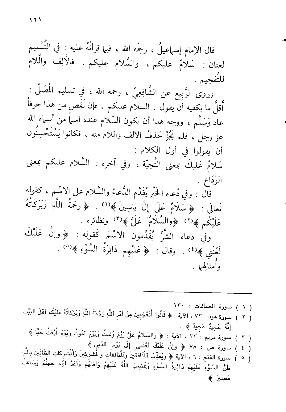 قال الإمام إسماعيلُ، رحِمَه الله، فيما قرأتُهُ عليه: في التَّسْليم لغتان: سَلامٌ عليكم، والسَّلام عليكم. فالأَلِف والَّلام للتَّفخِيم.
