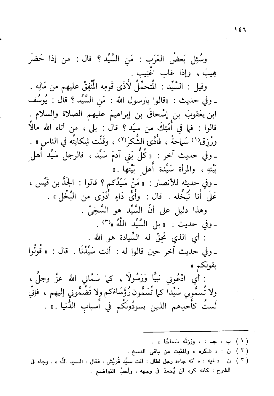 (¬3) ن: "فيه: "أنه جاءه رجل فقال: أنت سيِّد قُريْش، فقال: السيد الله". وجاء في الشرح: كأنه كره أن يُحمدَ في وجهه، وأَحبَّ التواضع.