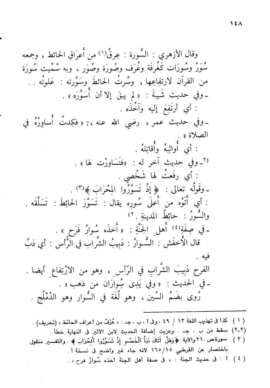 وقال الأزهري: السُّورة: عِرقٌ (¬1) من أَعرَاقِ الحائط، وجمعه سُوَرٌ وسُورَات كَغُرفَة وغُرَف وصُورَة وصُوَر، وبه سُمِّيت سُورَة من القرآن لارتفِاعِها، وسُرتُ الحائطَ وسَوَّرته: عَلوتُه ..
