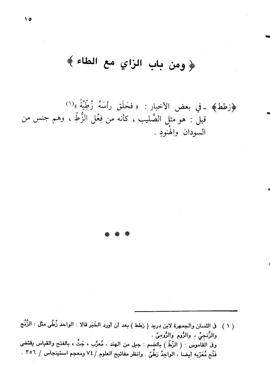 (¬1) في اللسان والجمهرة لابن دريد (زطط) بعد أن أورد الخَبَر قالا: الواحد زُطّى مثل: الزَّنْج والزَّنجِيَّ، والرُّوم والرُّومِيّ.
