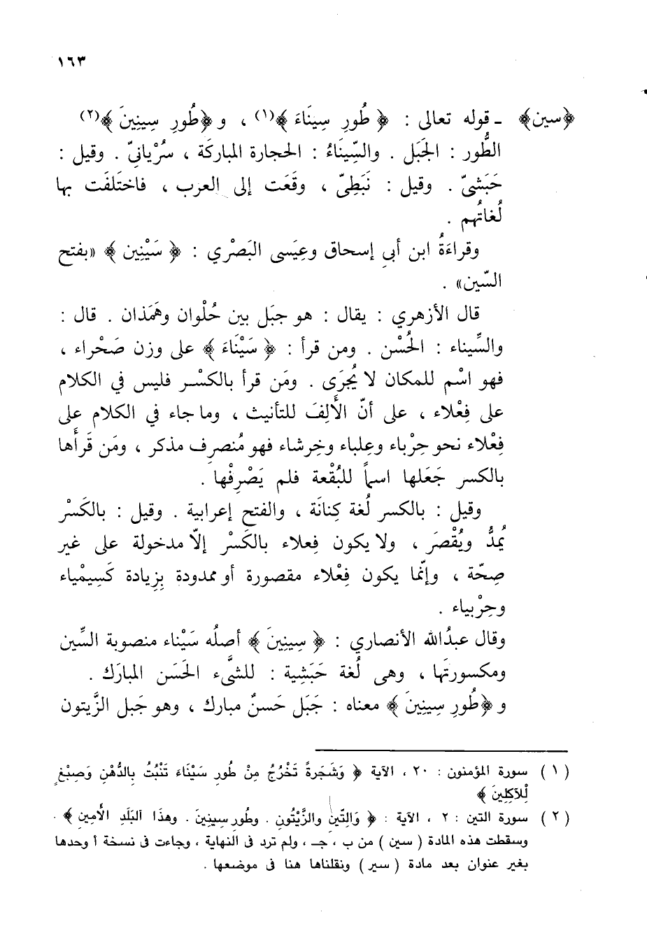 قال الأزهري: يقال: هو جبَل بين حُلْوان وهَمَذان. قال: والسِّيناء: الحُسْن. ومن قرأ: {سَيْنَاءَ} على وزن صَحْراء، فهو اسْم للمكان لا يُجرَى. ومَن قرأ بالكسْر فليس في الكلام على فِعْلاء، على أنّ الأَلِفَ للتأنيث، وما جاء في الكلام على فِعْلاء نحو حِرْباء وعِلباء وخِرشاء فهو مُنصرِف مذكر، ومَن قَرأَها بالكسر جَعَلها اسماً للبُقْعة فلم يَصْرِفْها.