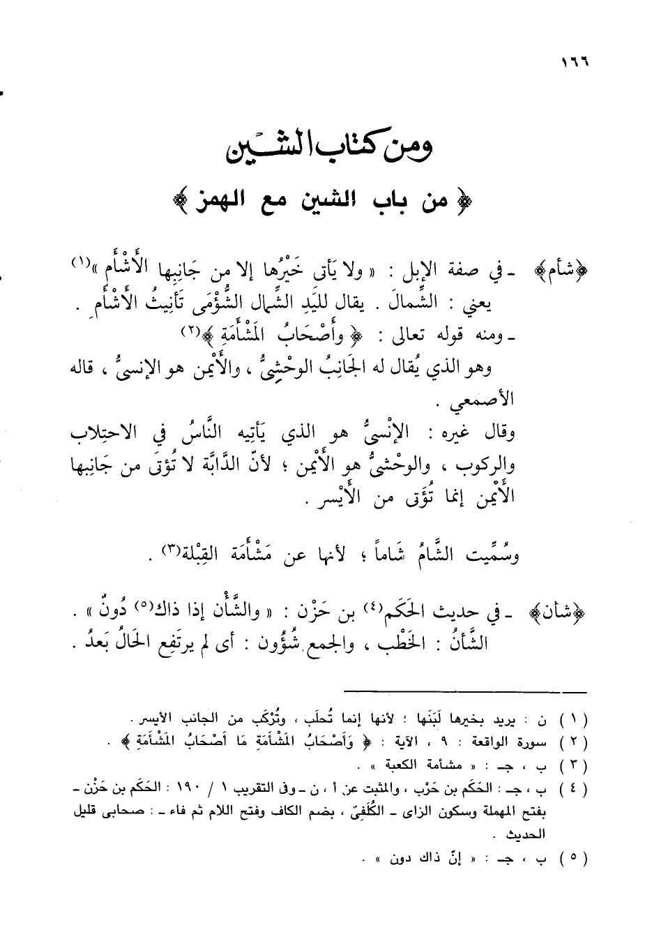 (شأم) - في صفة الإبل: "ولا يَأتيِ خَيْرُها إلا من جَانِبِها الأَشْأَم" (¬1)