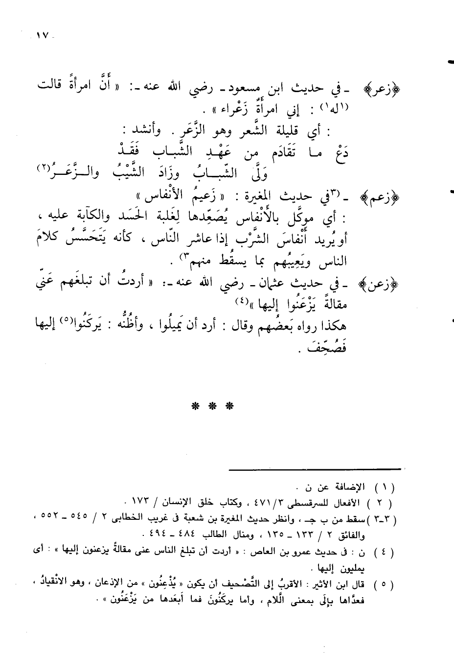 (زعر) - في حديث ابن مسعود - رضي الله عنه -: "أَنَّ امرأةً قالت (1 له 1): إني امرأَةٌ زَعْراء".