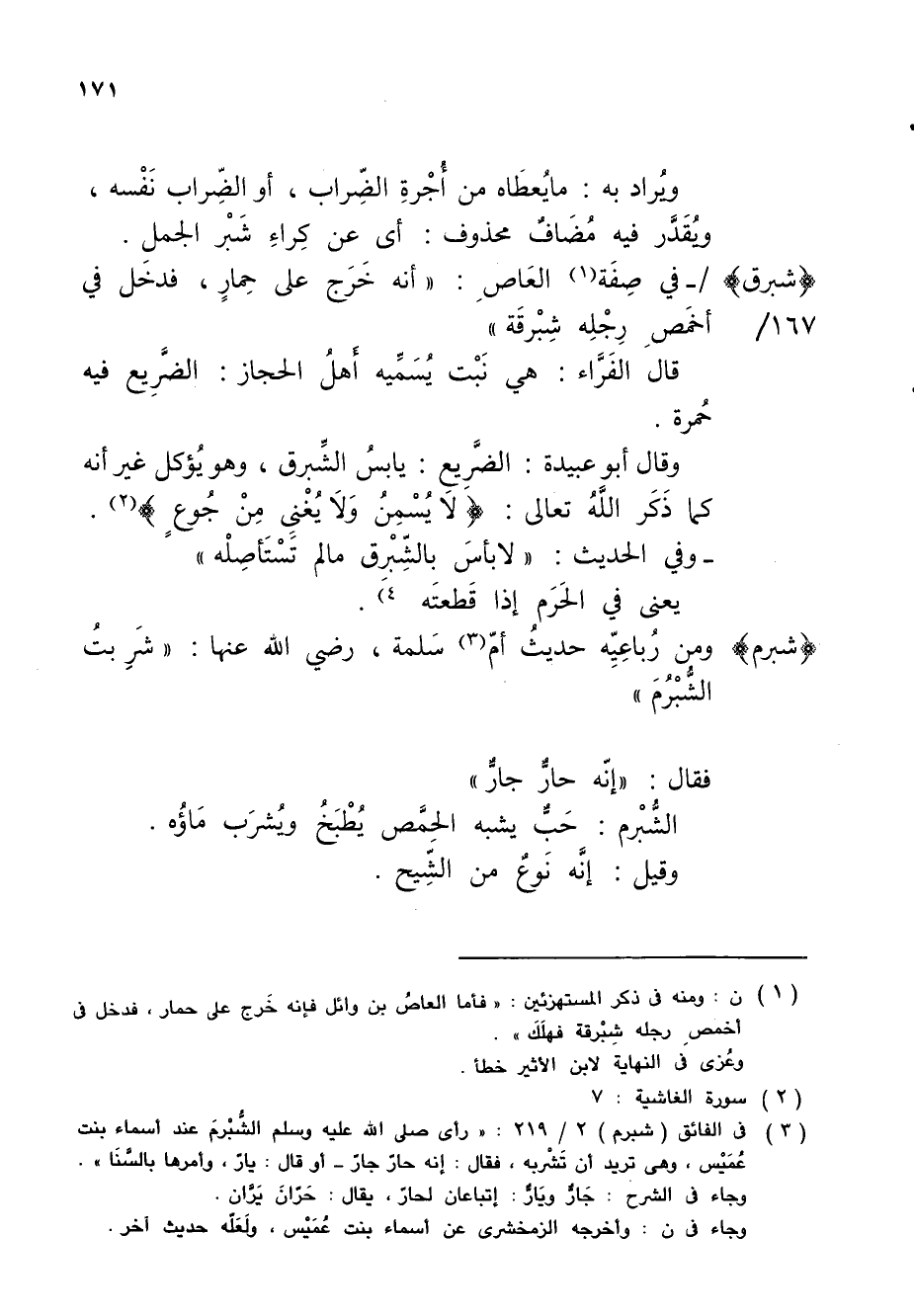 (¬3) في الفائق (شبرم) 2/ 219: "رأى صلى الله عليه وسلم الشُّبْرمَ عند أسماء بنت عُمَيْس، وهي تريد أن تَشْربه، فقال: إنه حارّ جارّ - أو قال: يارّ، وأمرها بالسَّنَا".