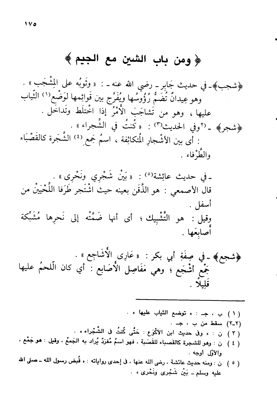 (¬5) ن: ومنه حديث عائشة، رضي الله عنها، في إحدى رواياته: "قُبض رسول الله - صلى الله عليه وسلم - بَينْ شَجْرى ونَحْري".