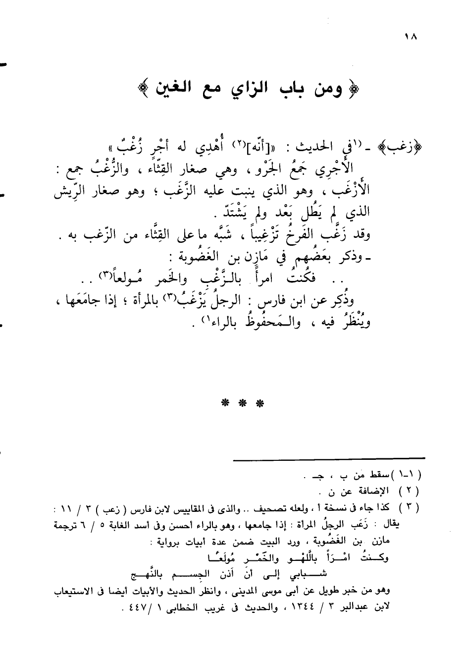 (¬3) كذا جاء في نسخة أ، ولعله تصحيف .. والذى في المقاييس لابن فارس (زعب) 3/ 11: يقال: زَعَب الرجلُ المرأة: إذا جامعها، وهو بالراء أحسن وفي أسد الغابة 5/ 6 ترجمة مازن بن الغَضُوبة، ورد البيت ضمن عدة أبيات برواية: