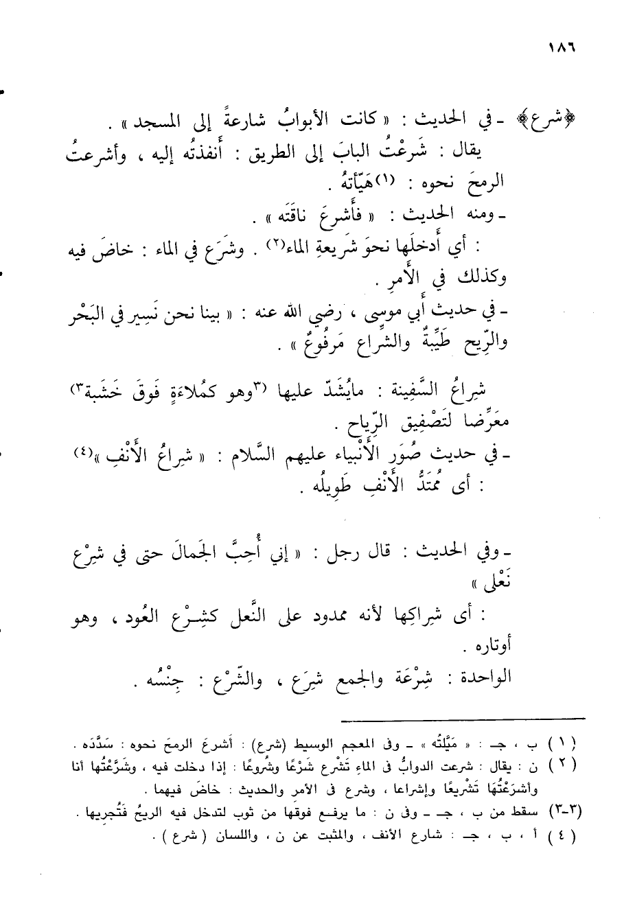 (¬2) ن: يقال: شرعت الدوابُّ في الماءِ تَشرْع شَرْعًا وشُروعًا: إذا دخلت فيه، وشَرَّعْتُها أنا وأشرَعْتُهَا تَشْرْيعًا وإشراعا، وشرع في الأمر والحديث: خاضَ فيهما.