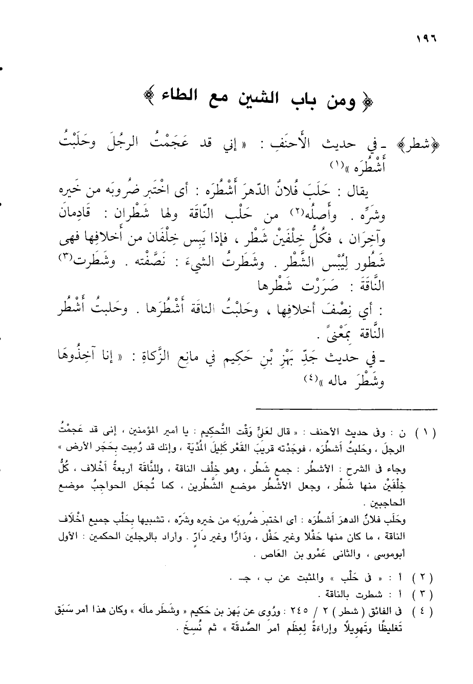 (¬1) ن: وفي حديث الأحنف: "قال لعَليًّ وَقْت التَّحكِيم: يا أمير المؤمنين، إني قد عَجمْتُ الرجلَ، وحَلبتُ أَشطُرَه، فوجَدْته قريبَ القَعْر كَلِيلَ المُدْيَة، وإنك قد رُمِيت بِحَجَر الأرض" وجاء في الشرح: الأشطُر: جمع شَطْر، وهو خِلْف الناقة، وللنَّاقَة أربعةُ أَخْلاف، كُلُّ خِلْفَينْ منها شَطْر، وجعل الأشْطُر موضع الشَّطْرين، كما تُجعَل الحواجِبُ موضع الحاجبين.
