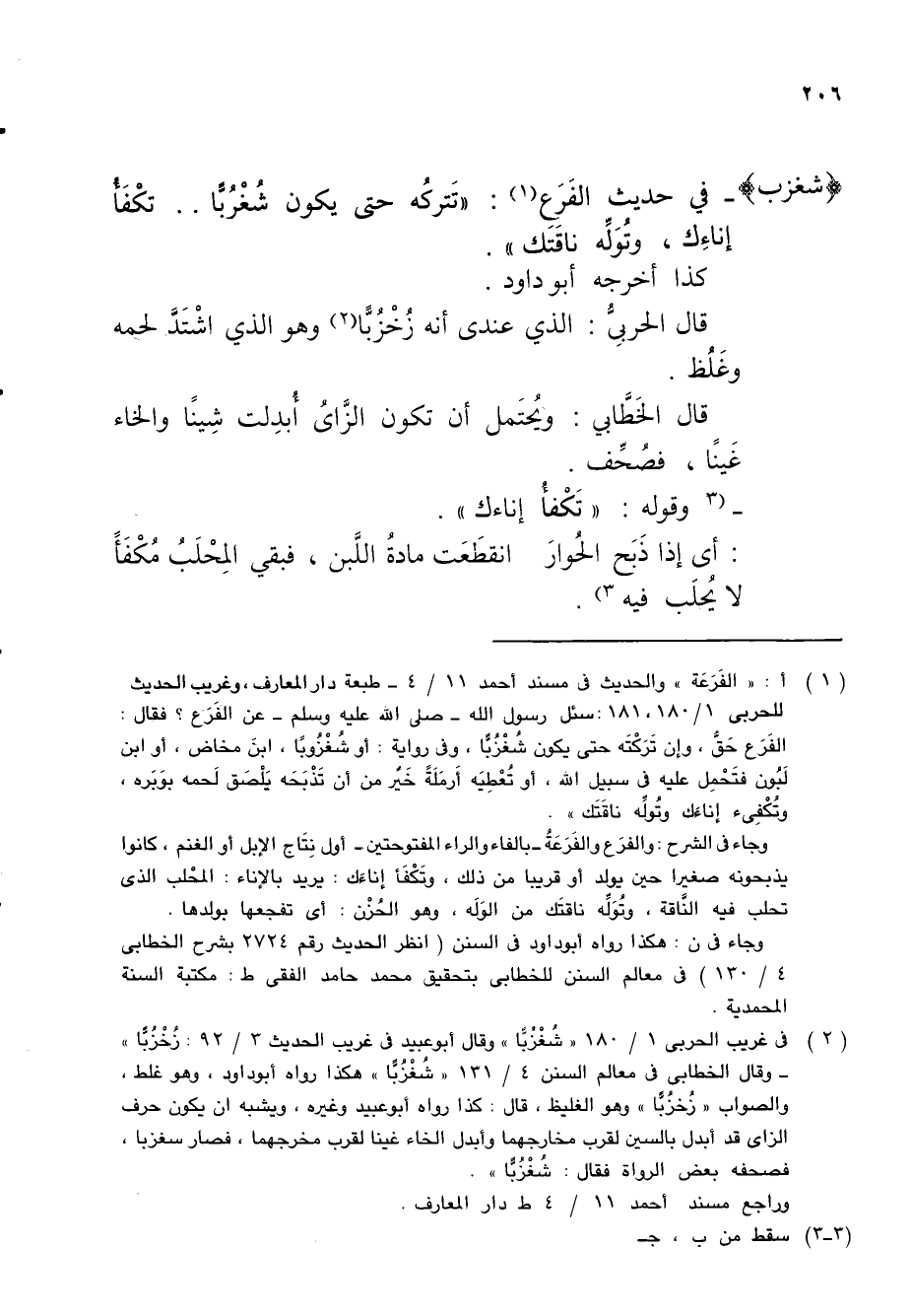 (¬1) أ: "الفَرَعَة" والحديث في مسند أحمد 11/ 4 - طبعة دار المعارف، وغريب الحديث للحربى 1/ 180, 181: سئل رسول الله - صلى الله عليه وسلم - عن الفَرَع؟ فقال: الفَرَع حَقُّ، وإن تَرَكْتَه حتى يكون شُغْزُبًّا، وفي رواية: أو شُغْزُوبًا، ابنَ مخاض، أو ابن لَبُون فتَحْمِل عليه في سبيل الله، أو تُعْطِيَه أَرمَلَةً خَير من أن تَذْبَحَه يَلْصَق لَحمه بوَبَره، وتُكْفِىء إناءَك وتُولِّه ناقَتَك".