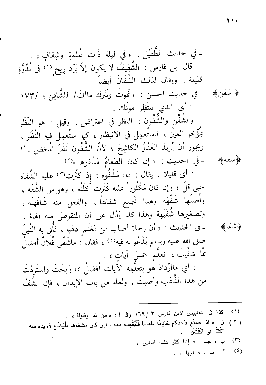 : أي قليلا. يقال: ماء مَشْفُوه: إذا كثُرت (¬3) عليه الشِّفاه حتى قَلّ؛ وإن كان مَكْثُوراً عليه كَثُرت أَكلَتُه، وهو من الشِّفَة، وأَصلُها شَفْهَة ولهذا تُجمَع شفاهاً، والفعل منه شَافَهتُه، وتصغيرها شُفَيْهة وهذا كله يَدُل على أن المنَقوصَ منه الهاءُ.