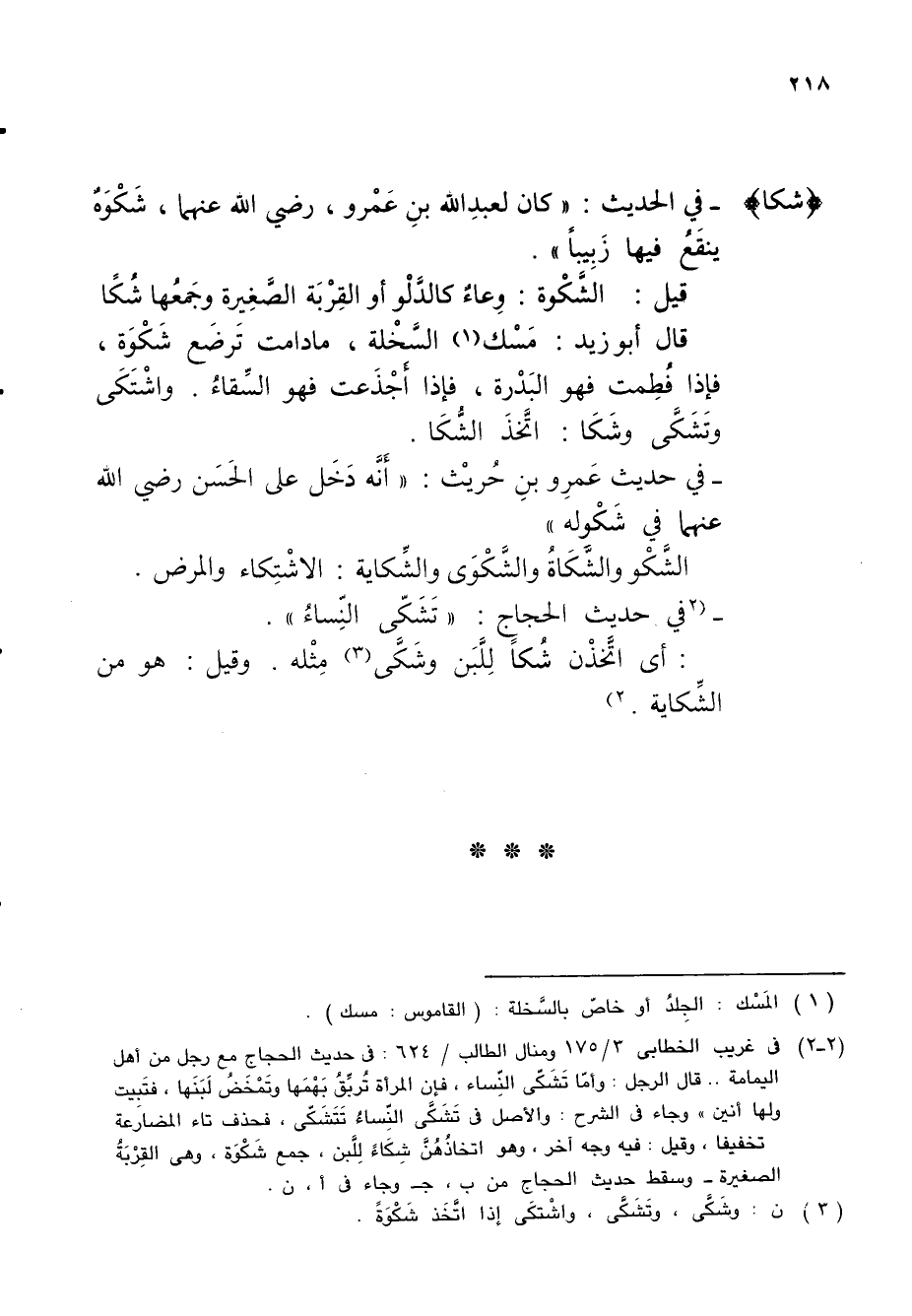 (2 - 2) في غريب الخطابى 3/ 175 ومنال الطالب/ 624: في حديث الحجاج مع رجل من أهل اليمامة .. قال الرجل: وأمّا تَشَكّى النِّساء، فإن المرأة تُربِّقُ بَهْمَها وتَمْخَضُ لَبَنَها، فتَبِيت ولها أنين" وجاء في الشرح: والأصل في تَشَكَّى النِّساءُ تَتَشَكّى، فحذف تاء المضارعة تخفيفا، وقيل: فيه وجه آخر، وهو اتخاذُهُنَّ شِكَاءً لِلَّبن، جمع شَكْوَة، وهي القِرْبَةُ الصغيرة - وسقط حديث الحجاج من ب، جـ وجاء في أ، ن.