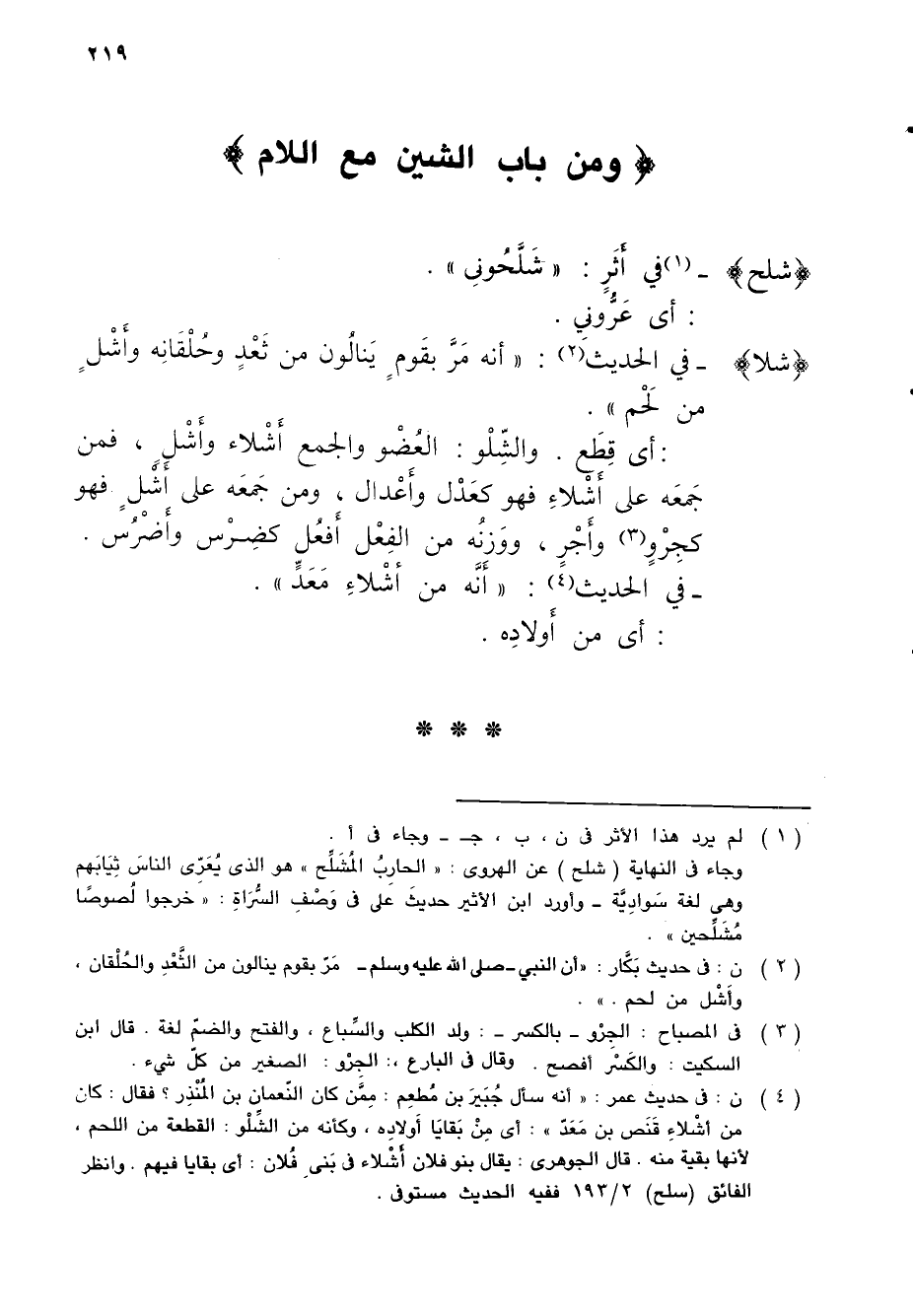 (¬4) ن: في حديث عمر: "أنه سأل جُبَيرَ بن مُطعِم: مِمَّن كان النّعمان بن المُنْذِر؟ فقال: كان من أشْلاءِ قَنَص بن مَعَدّ": أي مِنْ بَقايَا أَولادِه، وكأنه من الشِّلْو: القطعة من اللحم، لأنها بقية منه. قال الجوهرى: يقال بنو فلان أَشْلاء في بَنىِ فُلان: أي بقايا فيهم. وانظر الفائق (سلح) 2/ 193 ففيه الحديث مستوفى.